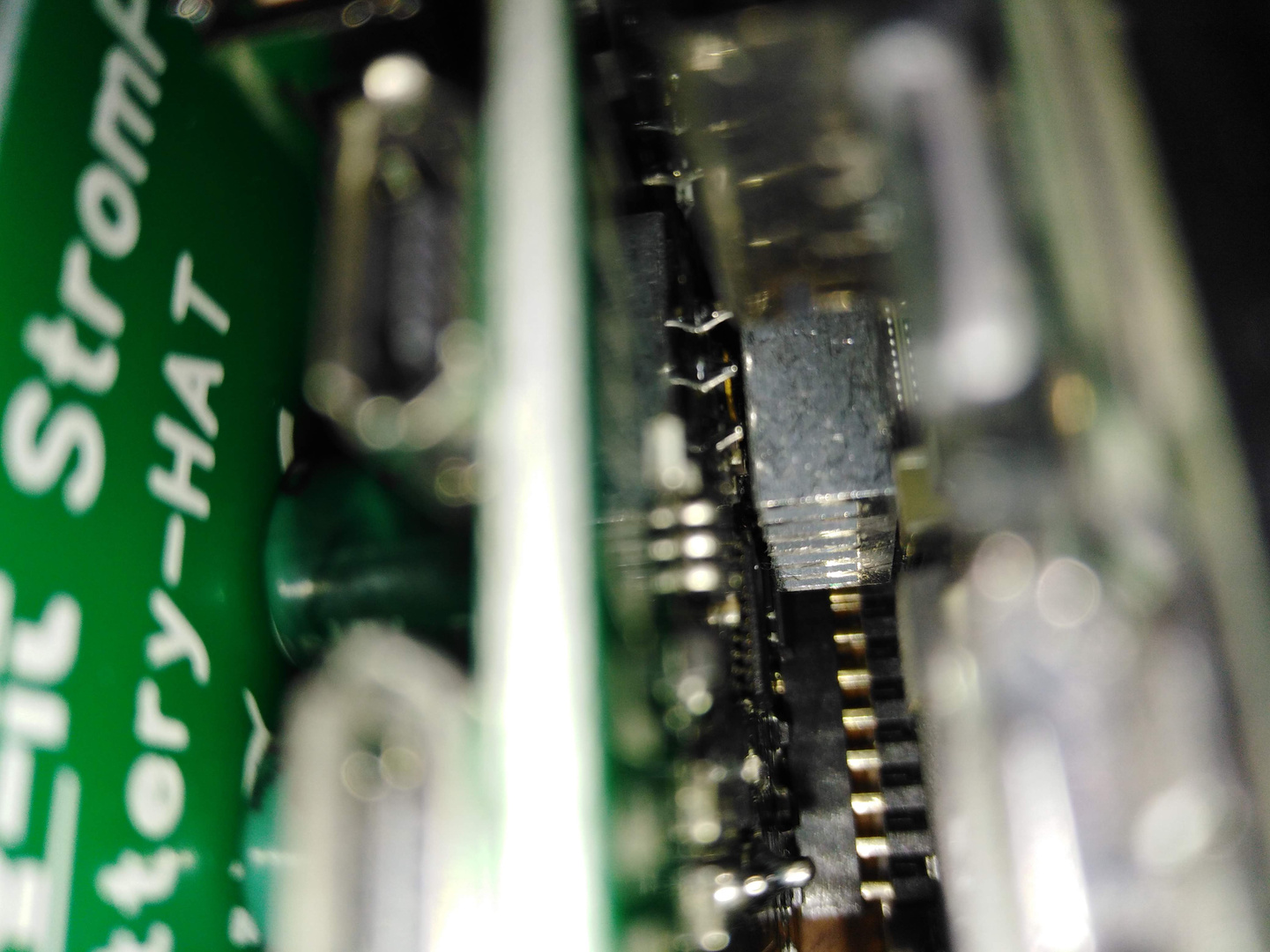 Die Steckleiste vom Strompi ist bewusst recht flach gehalten, um bei Stacking der Boards Platz zu sparen. Dies erweist sich jedoch bei dieser Konfiguration als hinderlich, denn der Alu-Kühlkörper des RPI-Prozessors berührt div. Pins auf der Unterseite des Strompi und schließt diese kurz. Da ich den Zusammenbau bis hierhin nur spannungslos getestet habe, kann ich nichts zu möglichen Folgen sagen.