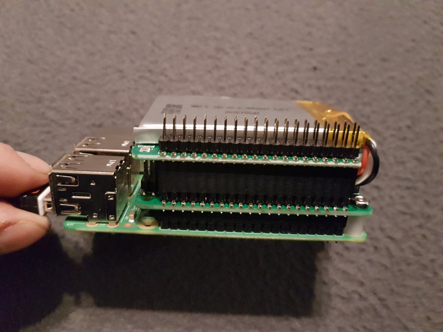 - Ohne Vorwarnung hat sich der RPI während des Betriebs ausgeschaltet, ironischerweise wohl durch einen Stromverlust. Am StromPI leuchtete nur noch eine blaue LED, die orangene LED am Battery Hub war aus. Ab diesem Zeitpunkt war es nicht mehr möglich das System in Betrieb zu nehmen, wenn der Battery Hub aufgesteckt war. Schon der erste Defekt?