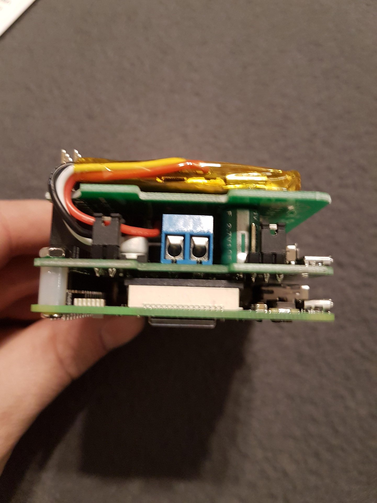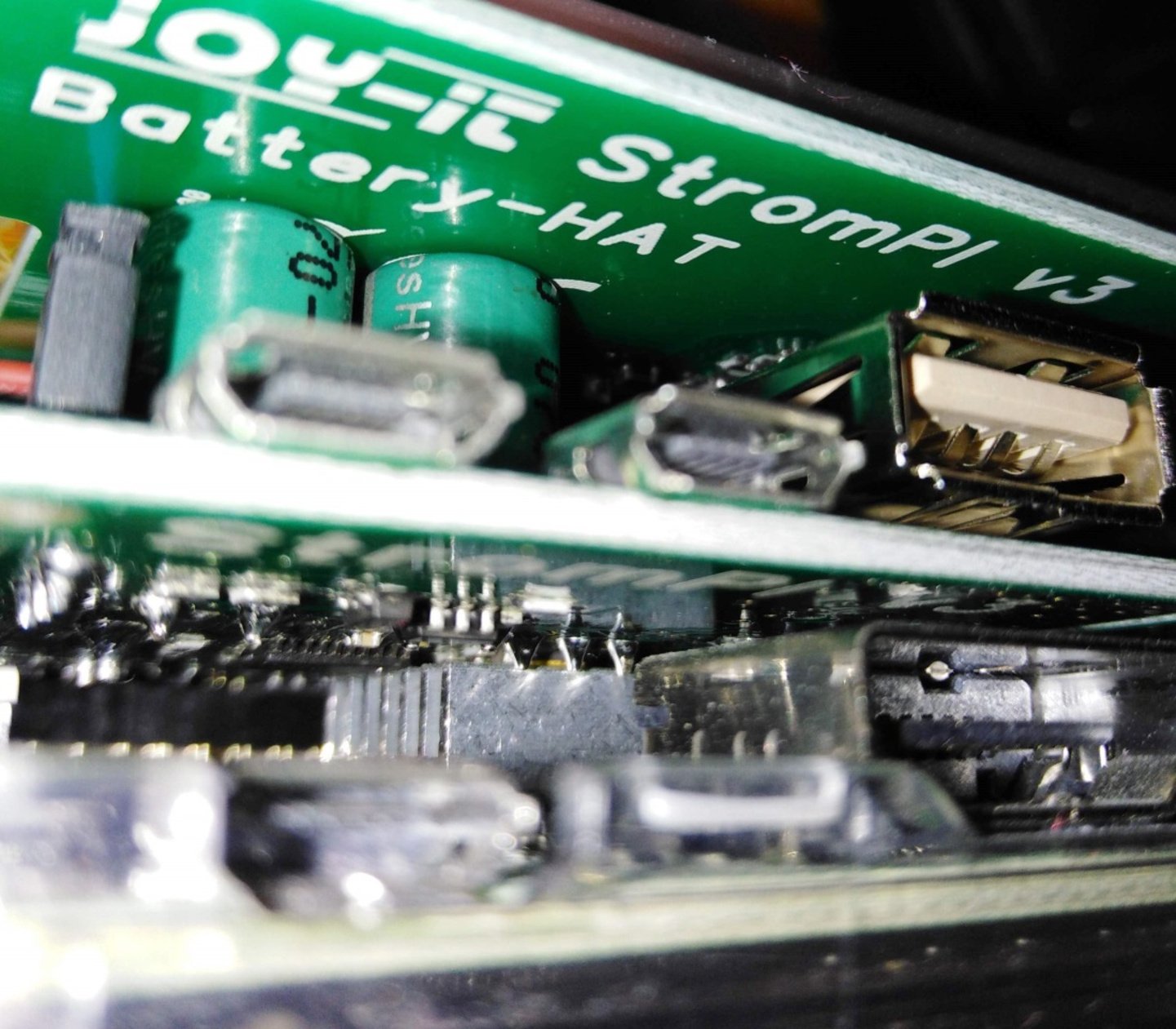 Aufgefallen ist, dass die Akku-Platine sich nicht exakt waagrecht zur StromPi Platine befestigen lässt, da die Steckerbuchsen eine unterschiedliche Höhe haben. Somit neigt sich die Akku Platine direkt am Akku Anschluss (kleinere Buchse) etwas nach unten. Damit liegt der Akkupack direkt auf den beiden Kondensatoren der StromPi Platine. Um dies zu vermeiden hebt man die Platine wieder etwas an, wobei die Kontakte dann allerdings nicht zu 100% verbunden sind. Funktional machte dies wohl keinen Unterschied, dennoch für diese Preiskategorie etwas unschön. Wie Anfangs erwähnt wären Abstandhalter sinnvoll.