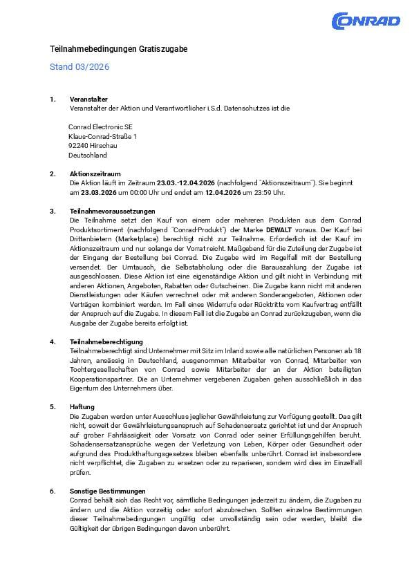 Gratiszugabe 3639912 DEWALT Akkupack-Ladegerät DCB1104M2-QW inkl. 2. Akku ab einem Mindestbestellwert von 349 € brutto (293,28 € netto): 1x pro Geschäftskunde/Privatperson bei Kauf mind. eines sofort verfügbaren DeWalt Aktionsprodukts. Gültig bis 12.04.2026 auf conrad.de. Nicht gültig für Marketplace Bestellungen (Drittanbieter). Nicht mit anderen Vorteilscodes kombinierbar. Nur solange Vorrat reicht.