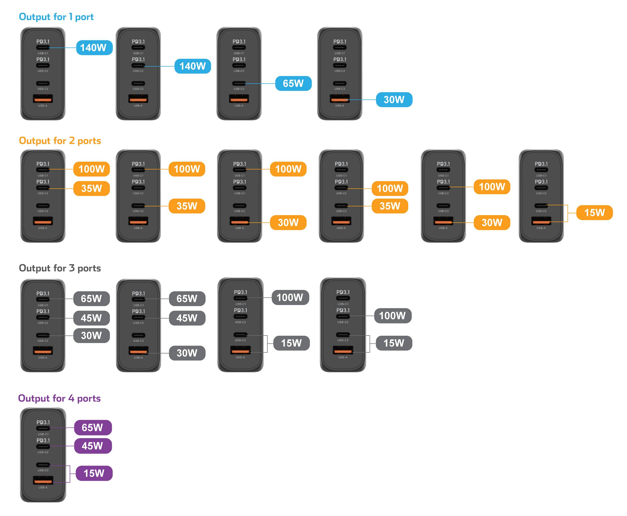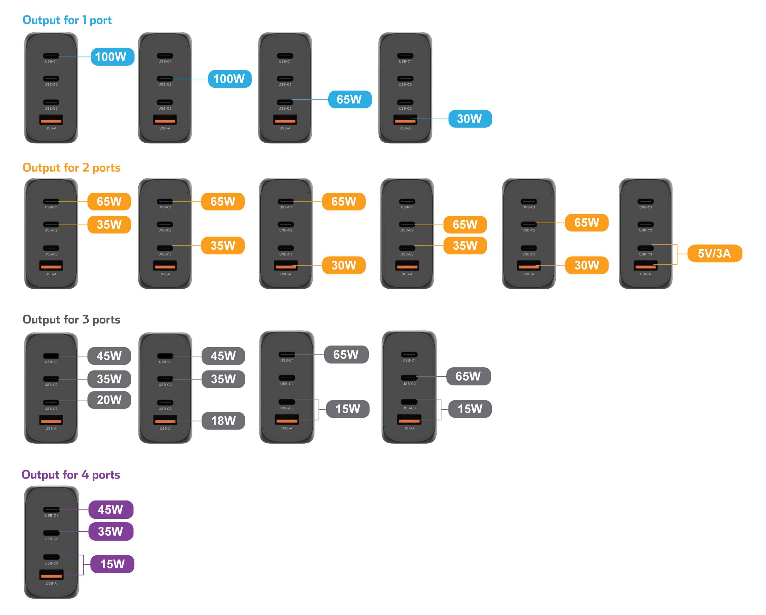 | USB-A | 30 W | 30 W | 30 W |