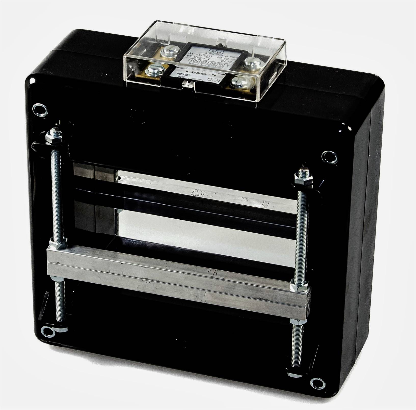 Stromwandler mit rechteckigem schwarzen Gehäuse, Metallstangen und einer transparenten Abdeckung oben, oft in Elektroinstallationen.