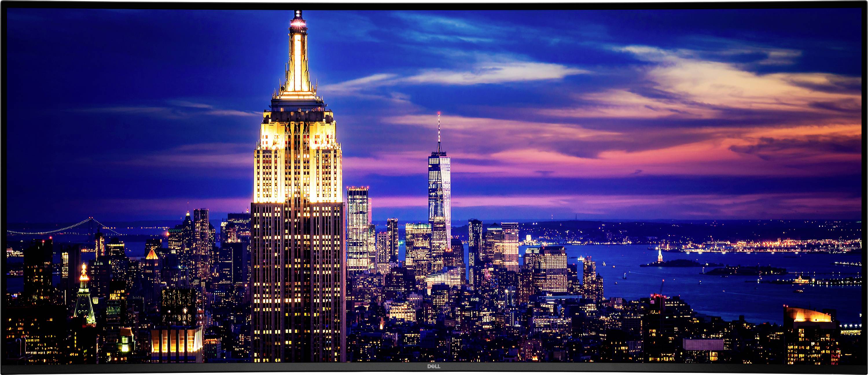 Eine Aussicht auf die Skyline einer Stadt in der Abenddämmerung mit dem leuchtend illuminierten Empire State Building im Vordergrund, umgeben von anderen Wolkenkratzern und einem farbenfrohen Himmel.