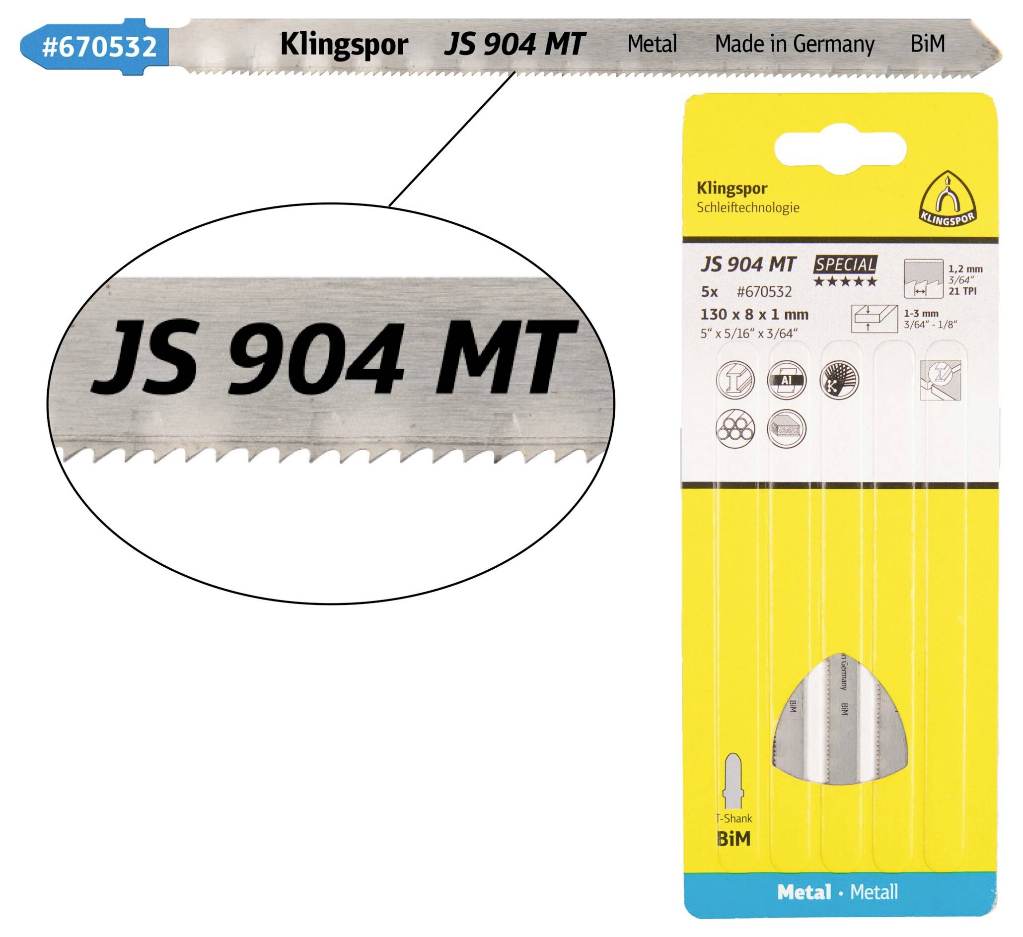 Klingspor 670532 JS 904 MT Stichsägeblätter, 130 x 8 x 1 mm Nutzlänge 110Bi-Metall, gefräst, gewellt , 21 Zähne pro Zoll