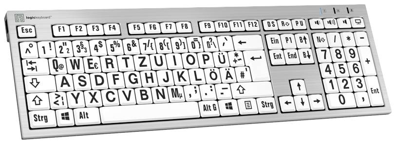 Logickeyboard XL-Print Kabelgebunden Tastatur Deutsch, QWERTZ Weiß Multimediatasten, USB-Hub, Geräuscharme Tasten