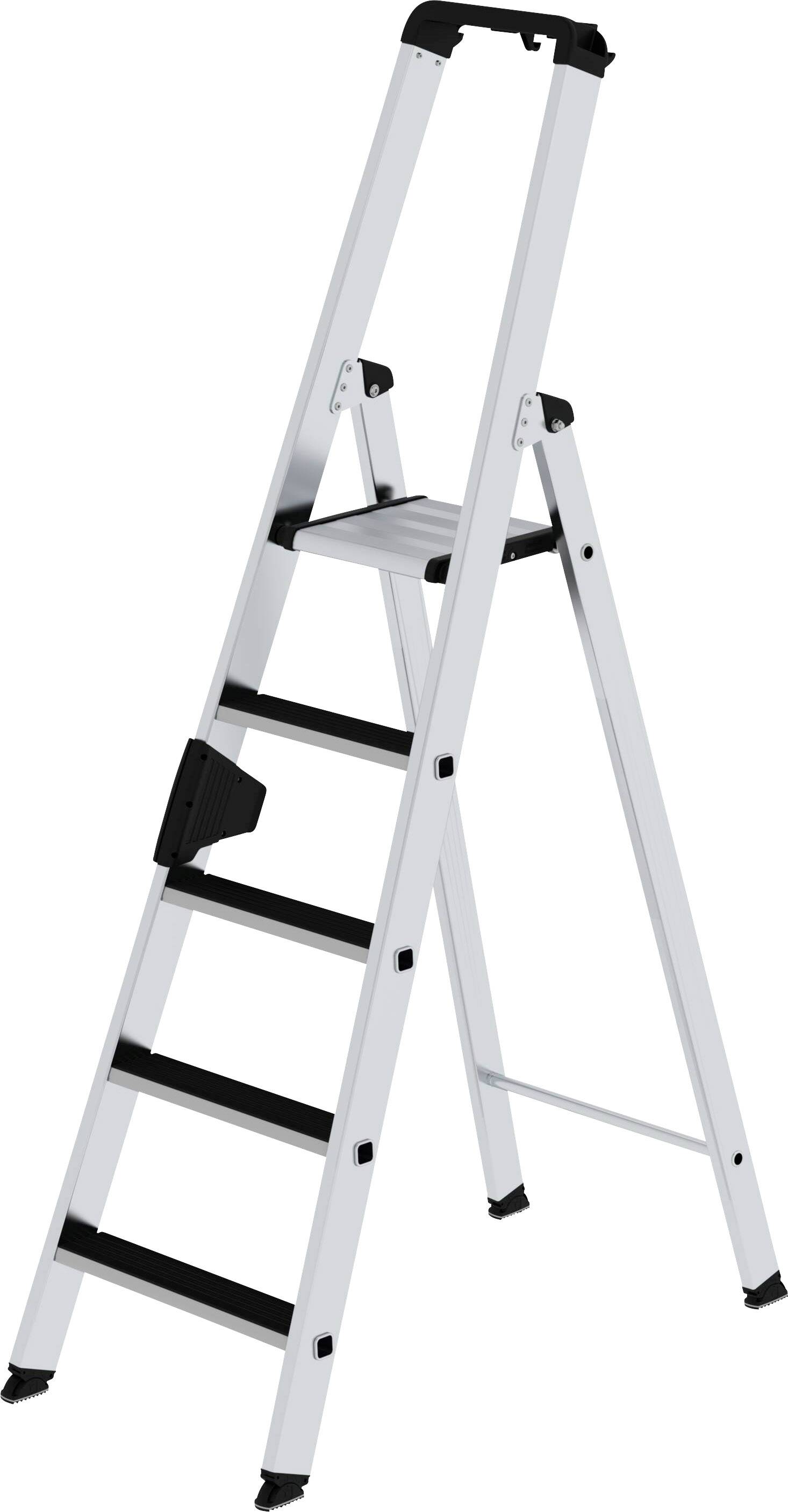 Eine silberne Klappleiter mit fünf Stufen und schwarzem Griff. Sie steht geöffnet und stabil auf ebenem Boden.