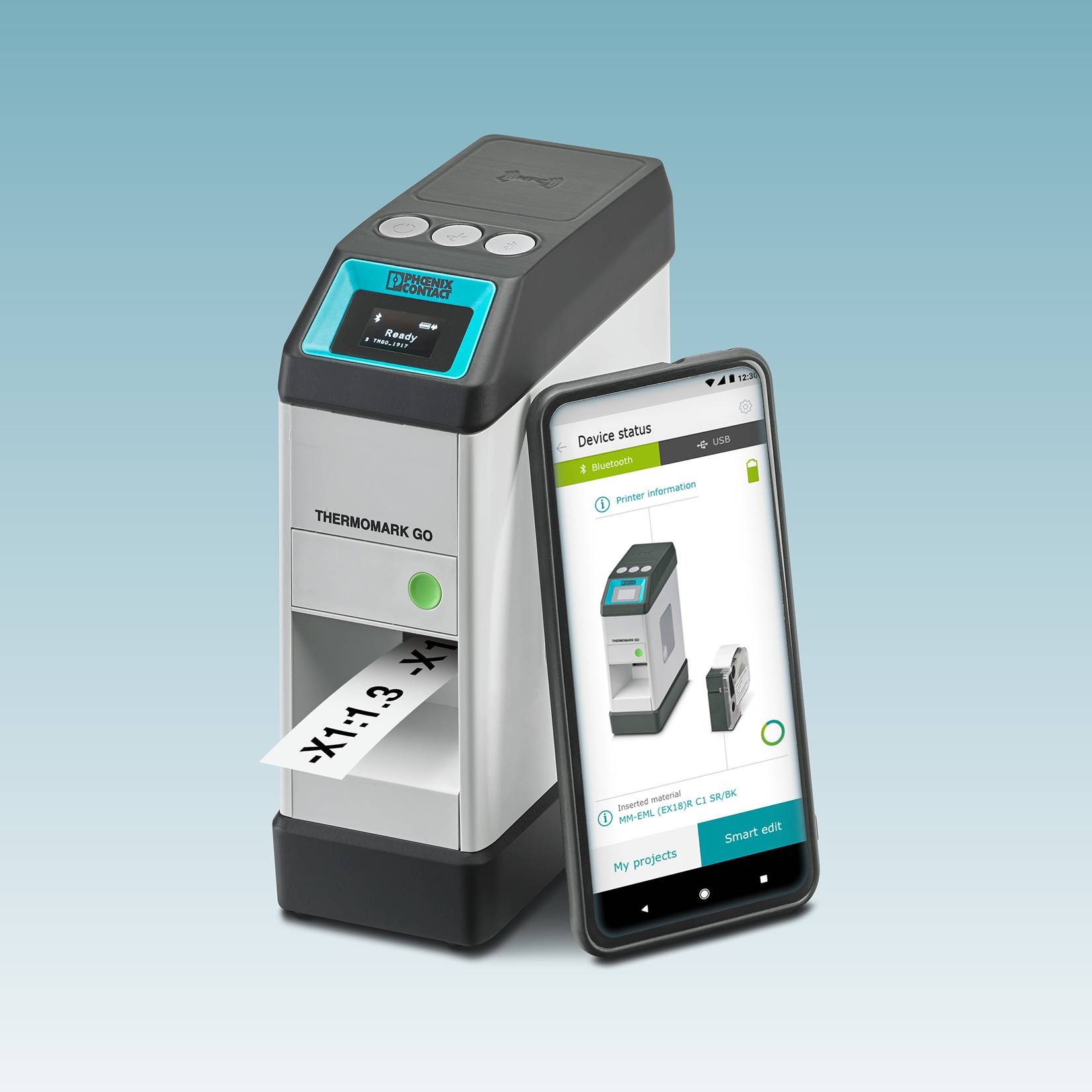 Einfach gestaltet sich auch die Bedienung, denn Smartphone oder Tablet können mit dem Thermomark Go kommunizieren. Die Kopplung erfolgt per Bluetooth mit NFC-Unterstützung: Einfach das Gerät auf den Etikettendrucker auflegen und die Verbindung wird automatisch hergestellt. Alternativ steht eine USB-Schnittstelle zur Verfügung. Mithilfe der Marking System App lassen sich auf dem Smart Device anschließend die Etiketten und Markierungen intuitiv gestalten und an den mobilen Drucker übermitteln. Dabei wird man Schritt für Schritt durch den Gestaltungs- und Druckvorgang geleitet.